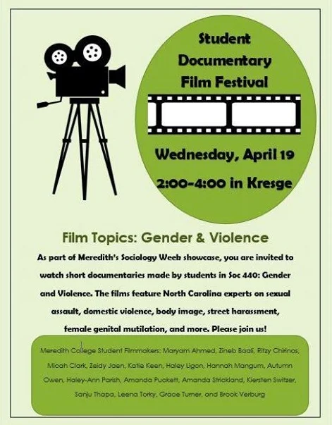 The festival features documentaries made by students of Professor Kris Macomber 's class on Gender and Violence, Meredith College, Raleigh, NC.